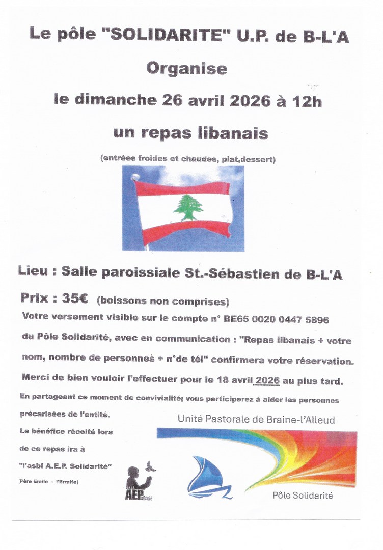 Le pôle « SOLIDARITÉ » de l’Unité Pastorale (U.P.) de Braine-l’Alleud organise le dimanche 26 avril 2026 à 12h00, son traditionnel repas libanais.